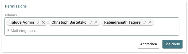 Nun kannst du unter Permissions beliebig viele Admins eintragen. Klicke dazu einfach in das Admin-Feld und gib die E-Mail-Adresse der gewünschten Person ein.