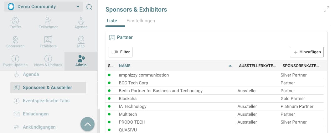 Du kannst für alle Sponsoren und Aussteller detaillierte Profile anlegen, sie nach Kriterien wie z.B. Name, Sponsoren-Typ (Gold, Silber, Platin etc.) und Aussteller-Typ filtern und sie auf der Landing Page (Zielseite) deiner Veranstaltung, wenn gewünscht, präsentieren.